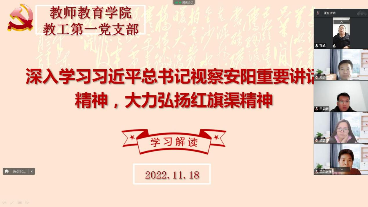11月18日,yabo888vip网页版登录教师第一党支部召开以“深入学习习近平总书记视察安阳重要讲话精神,大力弘扬红旗渠精神”为主题的组织生活会。会议通过腾讯会议举行,支部书记王丽主持会议,支部全体成员参加会议。