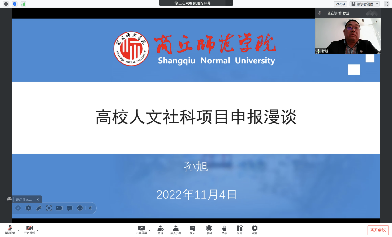 为加强学院科研实力,有效提升学院教师在项目申报、前期论证、项目实施等方面的能力。11月5日下午,yabo888vip网页版登录通过腾讯会议的方式在线举办了科研项目申报动员暨培训活动,yabo888vip网页版登录院长孙旭进行了《高校人文社科项目申报漫谈》专题讲座,就项目申报的相关问题进行了细致讲解,并就2023年的科研项目申报进行了动员部署。