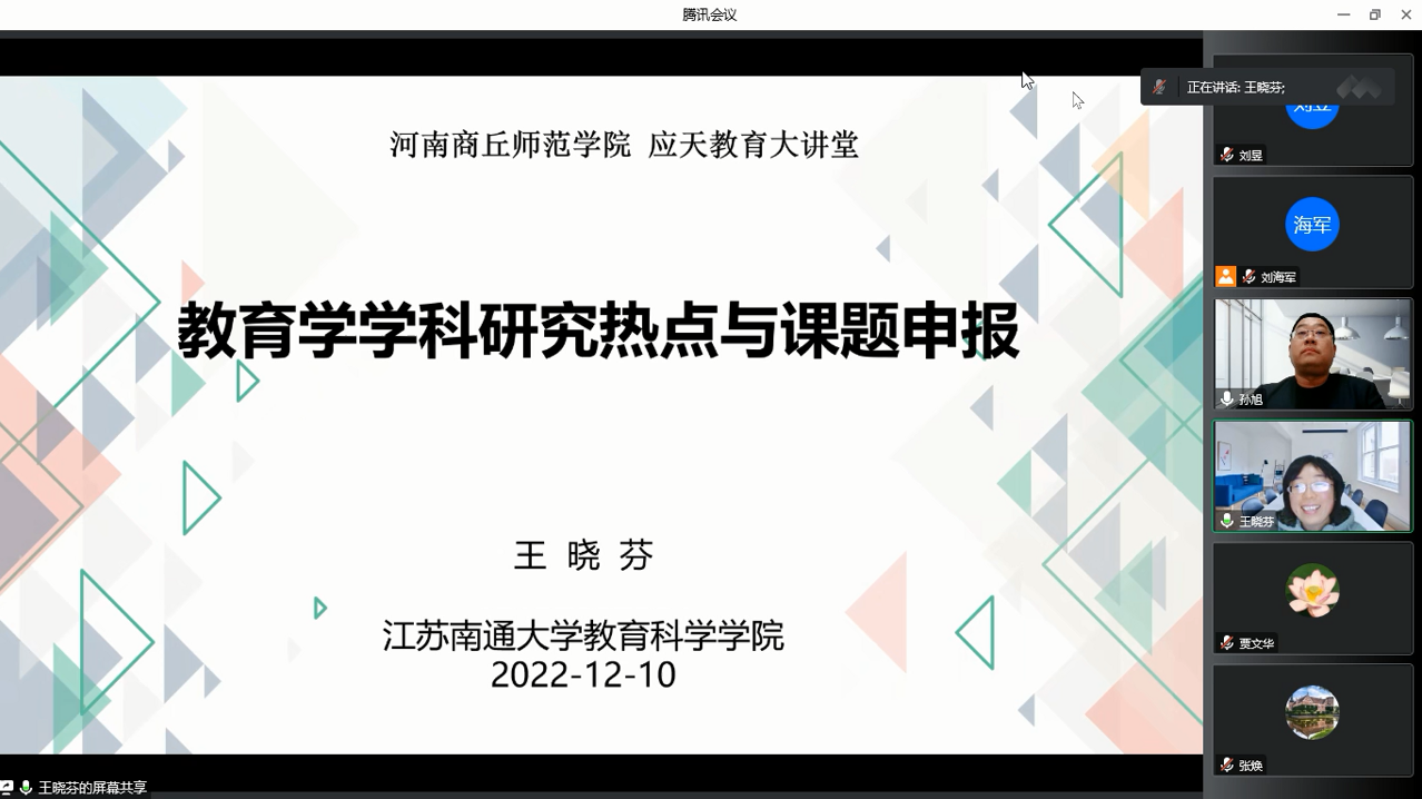 2022年12月10日晚上,为提升学院教师项目申报质量,我院特邀请南通大学教育科学学院王晓芬教授作了题为《教育学学科研究热点与课题申报》的学术讲座,此系“应天教育大讲堂”第三讲。讲座由yabo888vip网页版登录院长孙旭主持,我校教师教育专业相关师生参加了本次讲座。