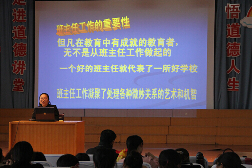 讲座围绕班主任工作以及如何成为一名合格的人民教师为中心展开。首先,蒯秀丽老师系统阐述了班主任工作的重要性,并对班主任工作的要求进行了阐述。她说:“如果把班集体比作一个交响乐团,那么班主任就好比是交响乐团的指挥,一个技艺高超的指挥能最大限度地调动每一个乐手的激情,协调好相互间的关系,共同演奏出和谐美妙的乐曲。”