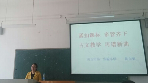 讲座一开始,陈老师在由中华文化引出文言文教学后,向学生出示、分析了小学语文新课标中文言文教学的总目标和分阶段目标并由此总结出此教学目标的三个原则。随后,陈老师从“激发兴趣,掌握方法”、“品读韵味,感知魅力”、“走进文本,理解含义”、“读写结合,拓展延伸”这四个方面来详细讲解如何为文言文教学带来新意。其中,陈老师着重对如何读古文进行了讲解,并结合自身的教学经历,使同学们更加直观地了解到小学语文中的文言文教学,受益匪浅。