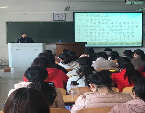 讲座伊始,张红艳老师提到,学习书法不仅可以提高审美情趣而且是育人的需要,因为电脑打字无法代替书法。随后张老师给同学们讲解了字的变过程:从甲骨文、金文、石鼓文、小篆、隶书、草书、行书一直到现在的楷书,总是字一直在不断地随着社会的发展而演变。最后张老师告诉同学们,要想练好字必须要练眼,即认真读贴。其次要练脑和练心,然后是练手。