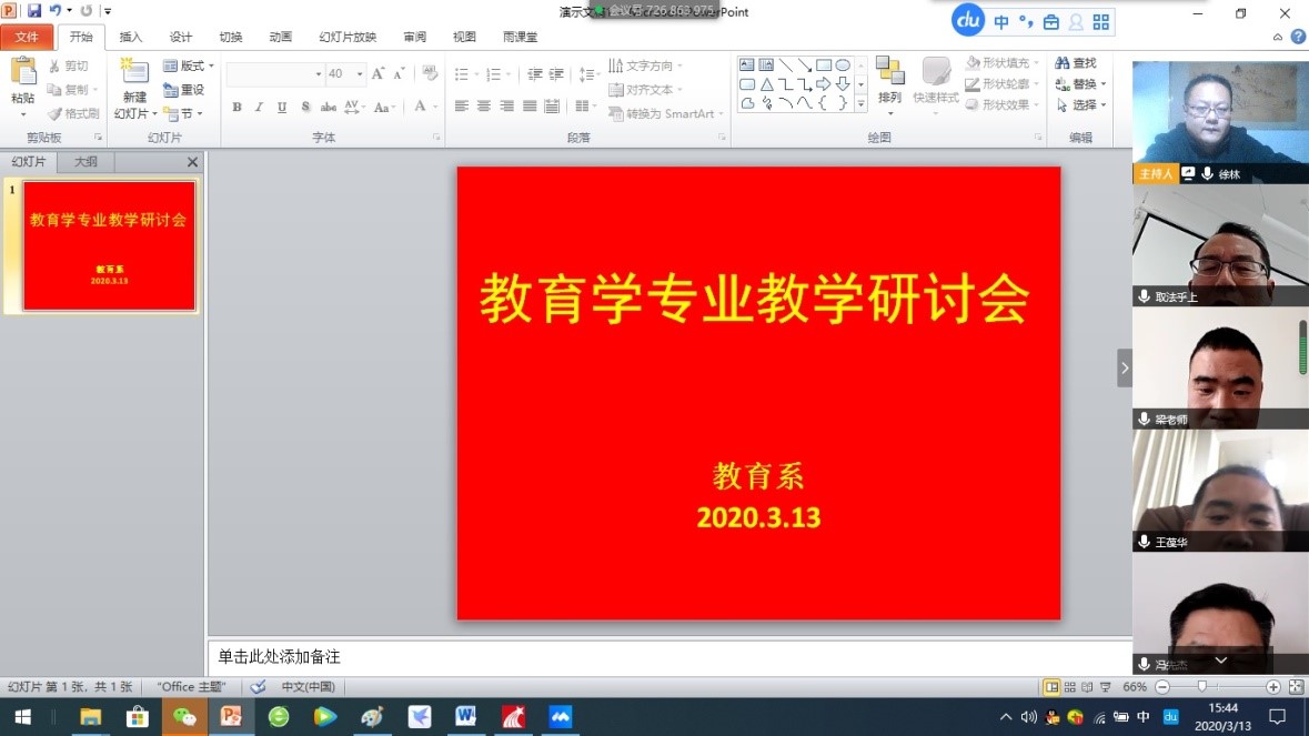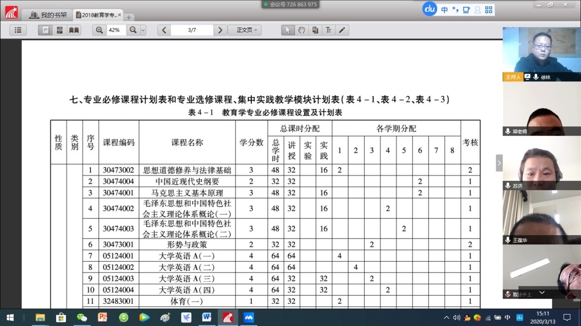 3.13号下午,教育系召开新学期教学研讨视频会议。会议由徐林主持。全体教育学专业教师参加了会议。会议主要进行了两项内容。第一,全体交流了在线教学经验。第二,集体讨论了2020年教育学专业人才培养方案。