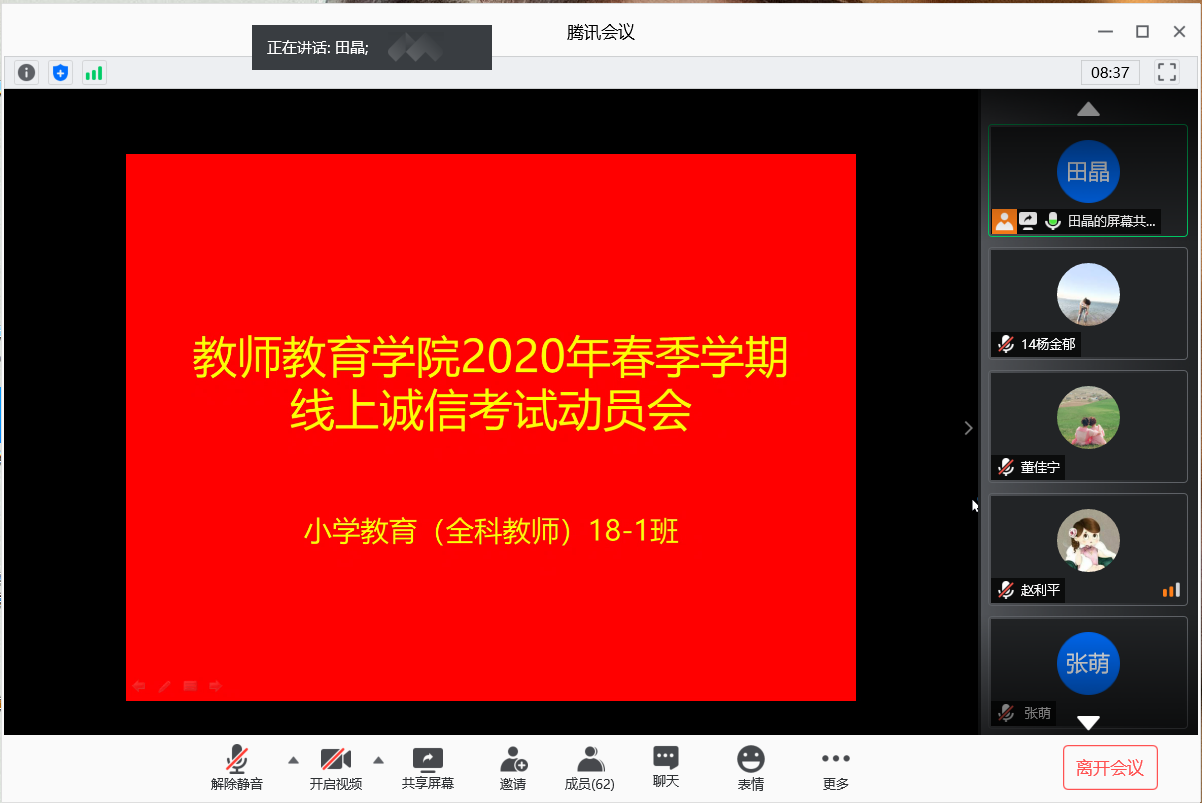 为加强学风建设,严肃考风考纪,让同学们做到诚信考试,2020年6月15日下午一点,班主任田晶老师带领18级小教全科1班的全体同学参加了这场“线上诚信考试动员会”。