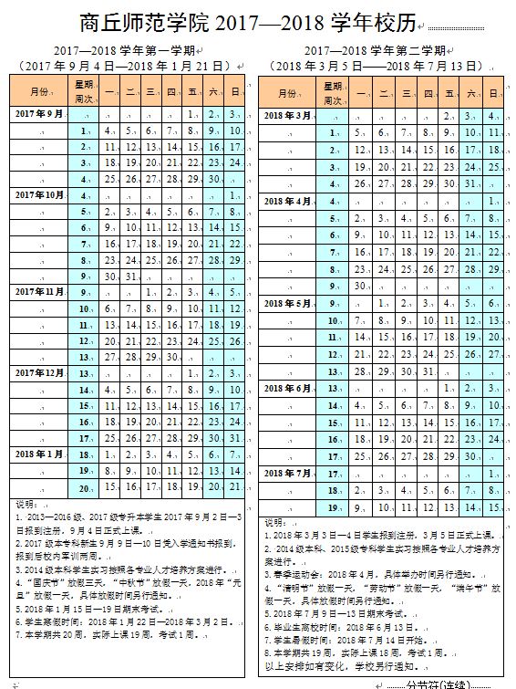 商丘师范学院2017-2018学年校历