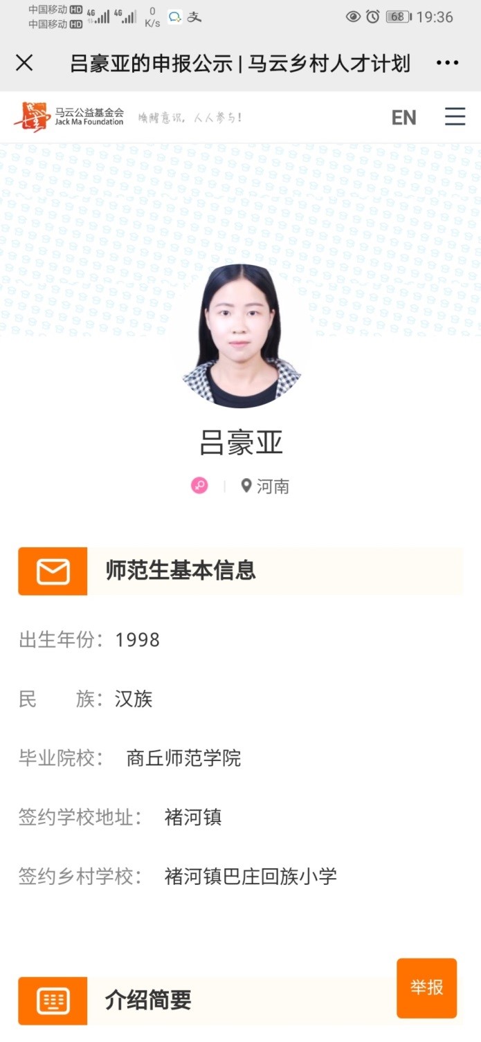 据悉,2017年12月“马云乡村师范生计划”正式启动,预计10年内至少投入3亿元,助力乡村教育新生力量。项目每年在全国招募主动投身乡村教育的应届毕业生,遴选300名优秀毕业生。吕豪亚老师将获得“马云乡村师范生支持计划”持续五年、总计 10 万元的资金激励,助力她在乡村一线成就个人价值。她还将能享受成长营,云课堂,乡村教育学苑等优秀平台和资源。