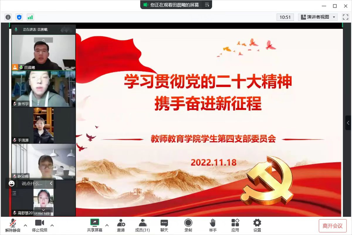 为深入贯彻学习党的二十大精神,11月18日,学院学生第四党支部召开了以“学习贯彻党的二十大精神,携手奋进新征程”为主题的学习会,会议由支部书记田晨曦主持,支部全体党员参与。