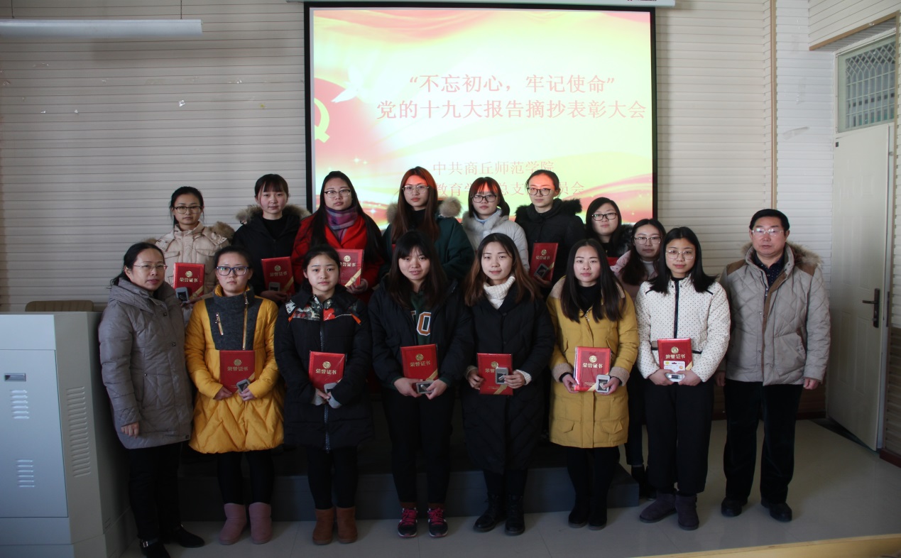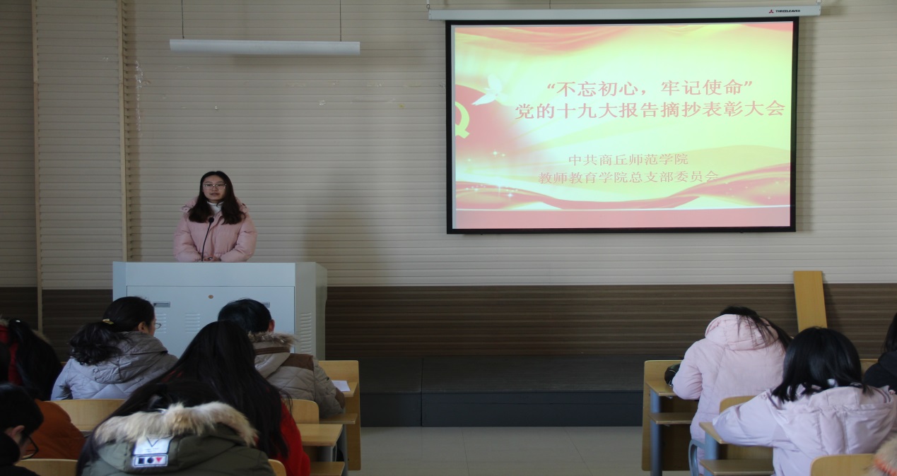 为使大学生深入学习领会十九大精神内涵,更好地了解党章知识,提高思想觉悟。2018年01月11日上午,我院在平原路校区实验组团楼310教室举行了“不忘初心、牢记使命”党的十九大报告摘抄表彰大会,出席本次活动的有党总支书记刘骥鹏,党总支副书记肖爱芝,董若颖老师,侯文娟老师,赵静老师,王运生老师。