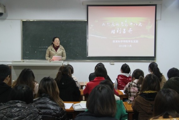中国共产党第十八次全国代表大会于2012年11月8日上午9时在北京人民大会堂隆重召开,为了进一步学习党的十八大精神,教育科学学院组织学生党员于11月12日晚6:30在综合楼120教室召开党员、预备党员大会,一起学习贯彻党的十八大精神。