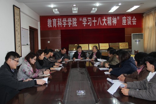 ◇2012年11月23日下午,教育科学学院在院会议室召开了“学习十八大精神”座谈会。参加会议的由教育科学学院韩桂玲院长、肖爱芝副书记、秦彧和王军强副院长、教科院的教师代表。