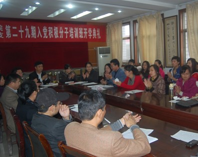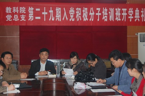 商丘师范学院教育科学学院于2011年11月4日下午3:00—5:00在行政楼五楼的会议室举办了第29期入党积极分子培训班开学典礼。参加典礼的有教科院的领导、辅导员、全体教职工以及第29期的入党积极分子。