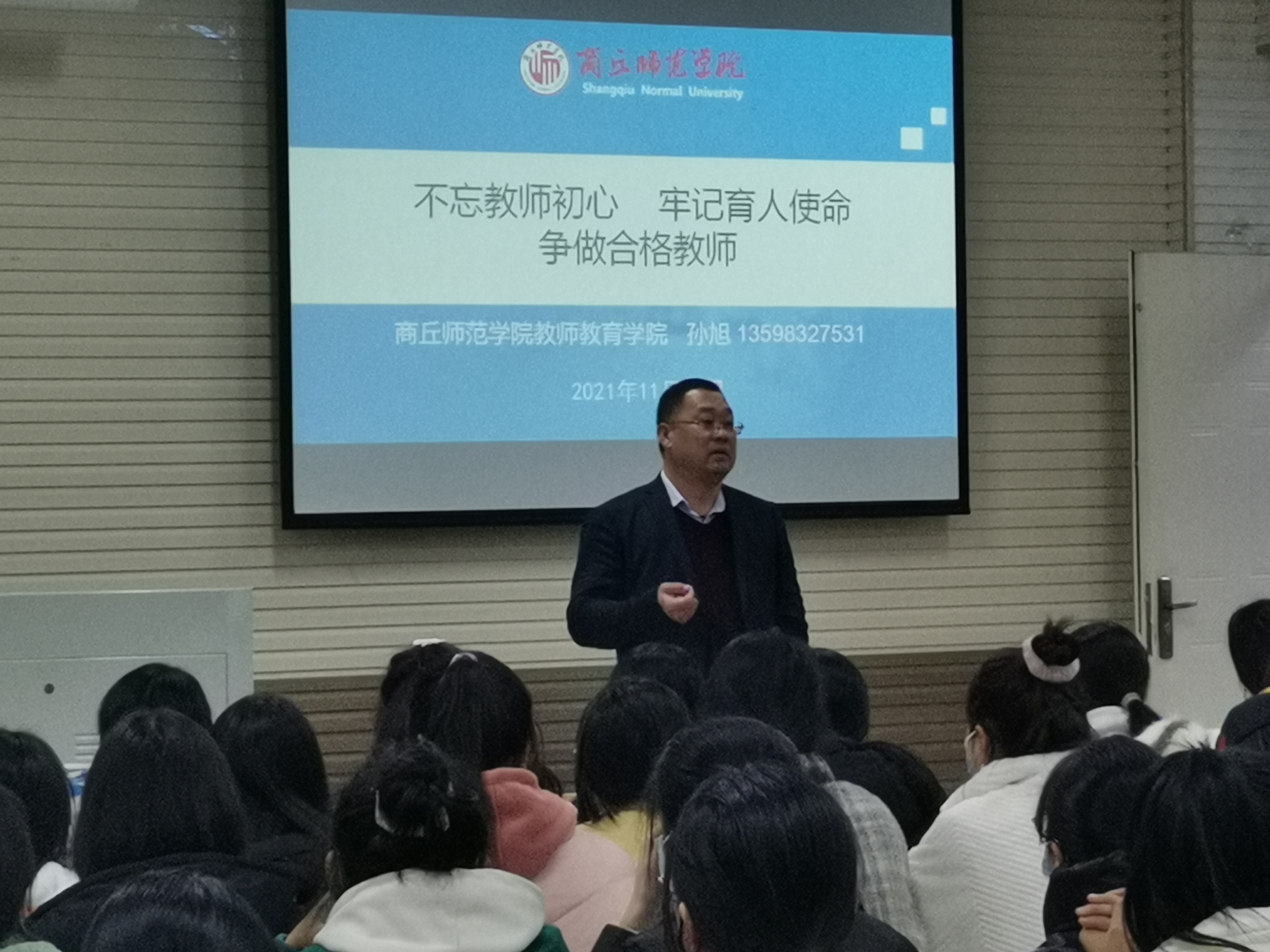 11月22日,yabo888vip网页版登录院长孙旭在汉梁楼为2021级学前教育专业学生上了堂“不忘教师初心 牢记育人使命 争做合格教师”的主题班会。