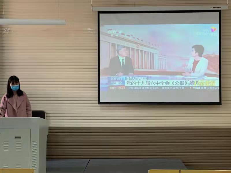 为深入学习贯彻党的十九届六中全会精神,学院学生第一党支部于11月19日在汉梁楼310教室 以“学习党的十九届六中全会公报”为主题的党日活动。支部书记李秀勤主持活动。全体学生党员同志到场参加。